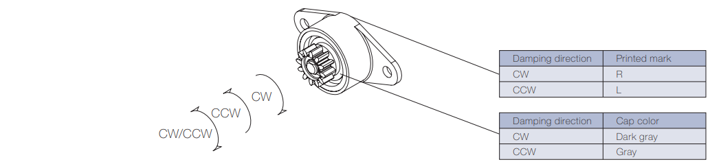 所有旋转阻尼器的扭矩均在 20 min⁻¹ 的转速下测量。 无齿轮的产品在型号名称末尾带有 “(G-L)”。 TD96 型旋转阻尼器无双向规格。